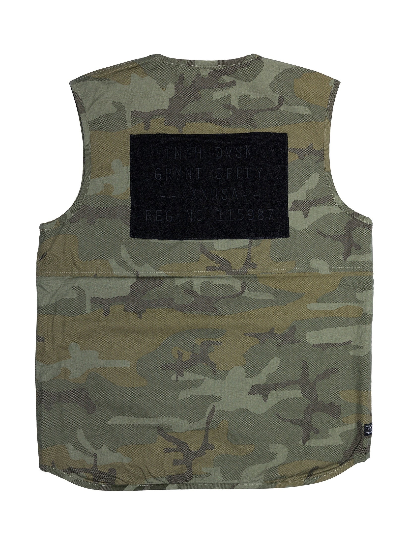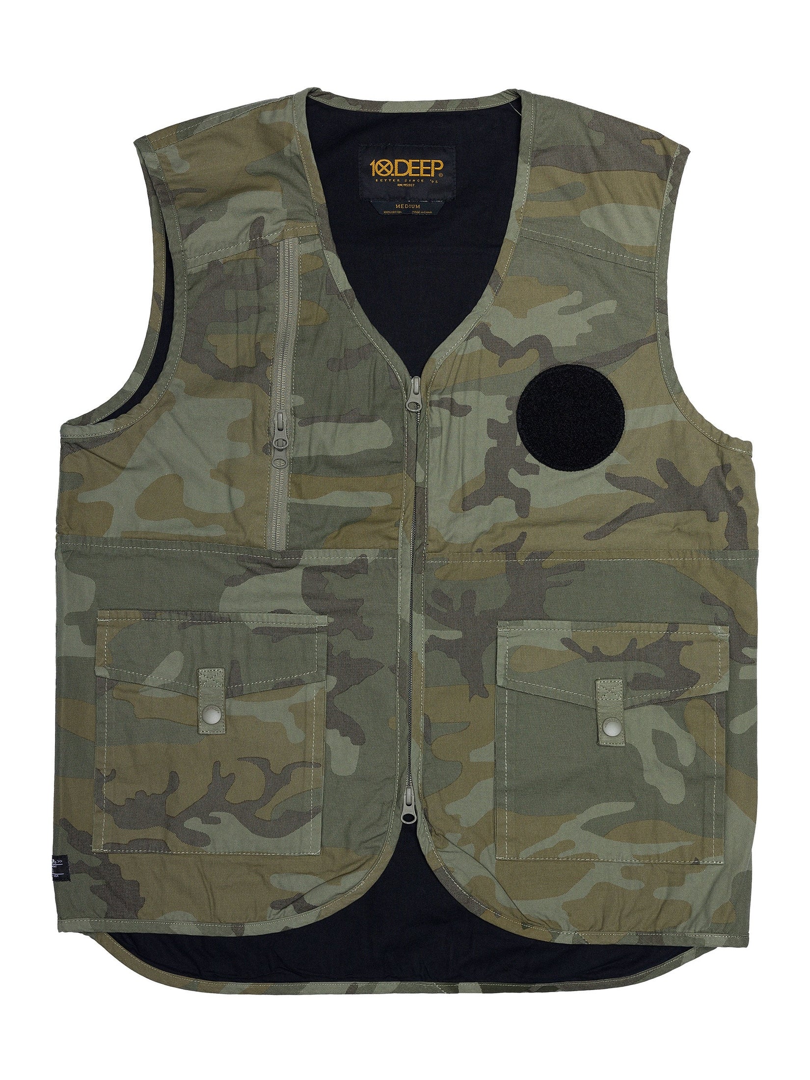 Embrace a bold, utilitarian look with the 10.Deep A.W.O.L Camo Vest. Crafted from 100% cotton woven fabric, this sleeveless jacket offers durability and comfort. The camo pattern adds a rugged edge, making it a versatile layering piece for various outfits.