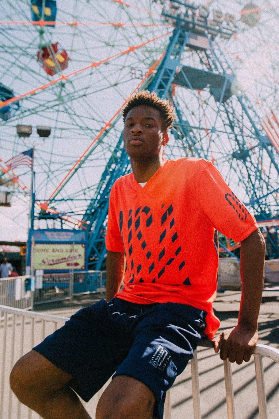 - Color: Bright red with navy graphics
