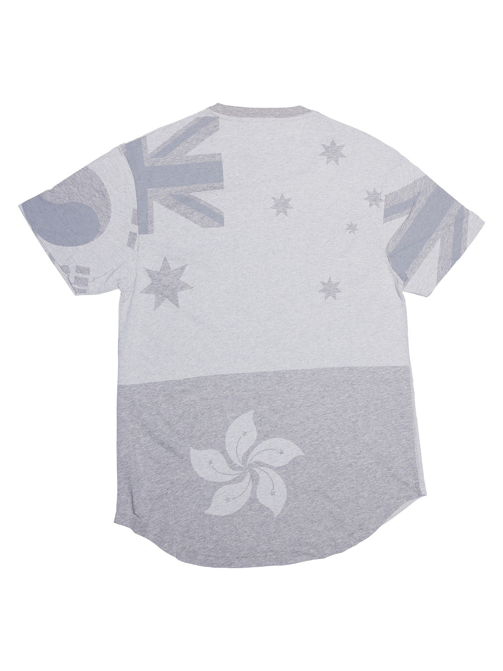 Cut from shadow and sewn with symbolism, this tee taps into international iconography with a ghosted collage of flags from around the globe. It’s got that minimalist energy with a militant undertone—like a graphic protest in stealth mode. Scoop hem keeps it modern, while tonal printing lets the details speak when the light hits just right.