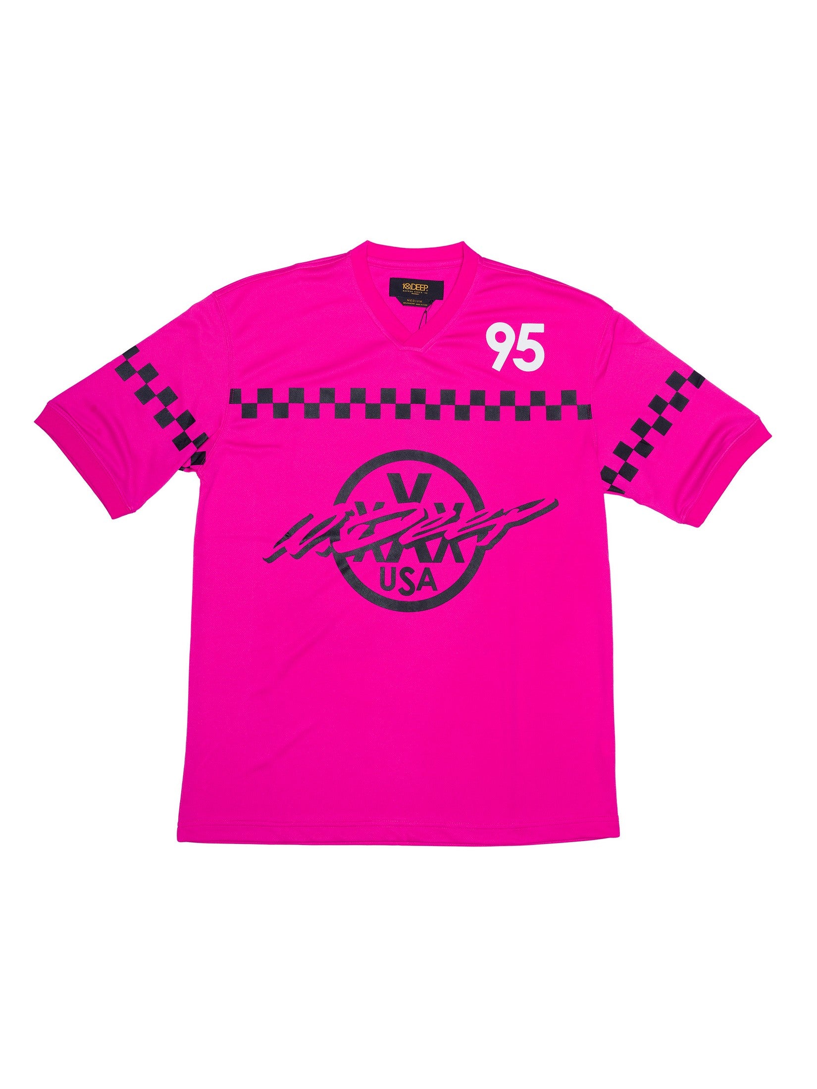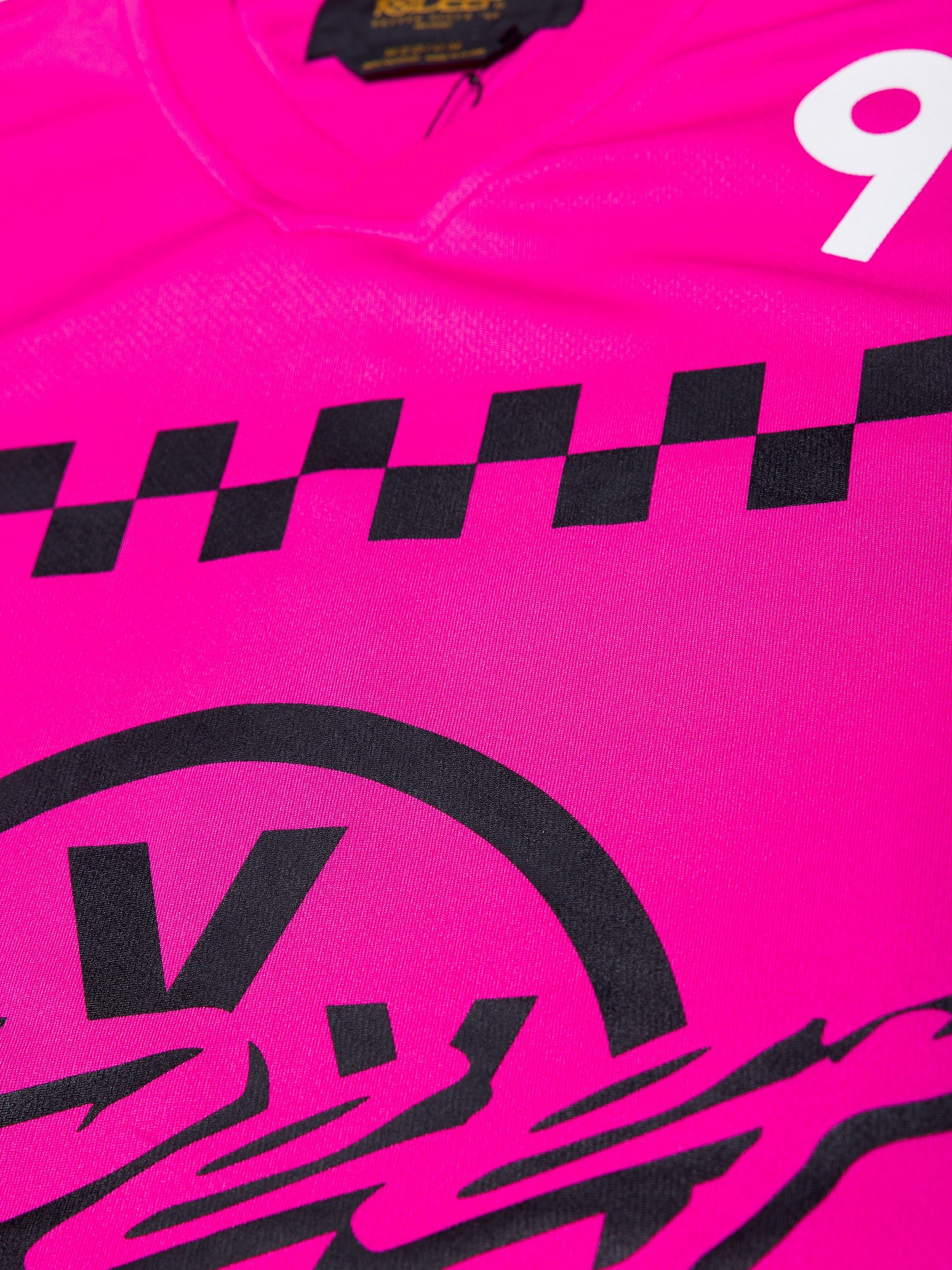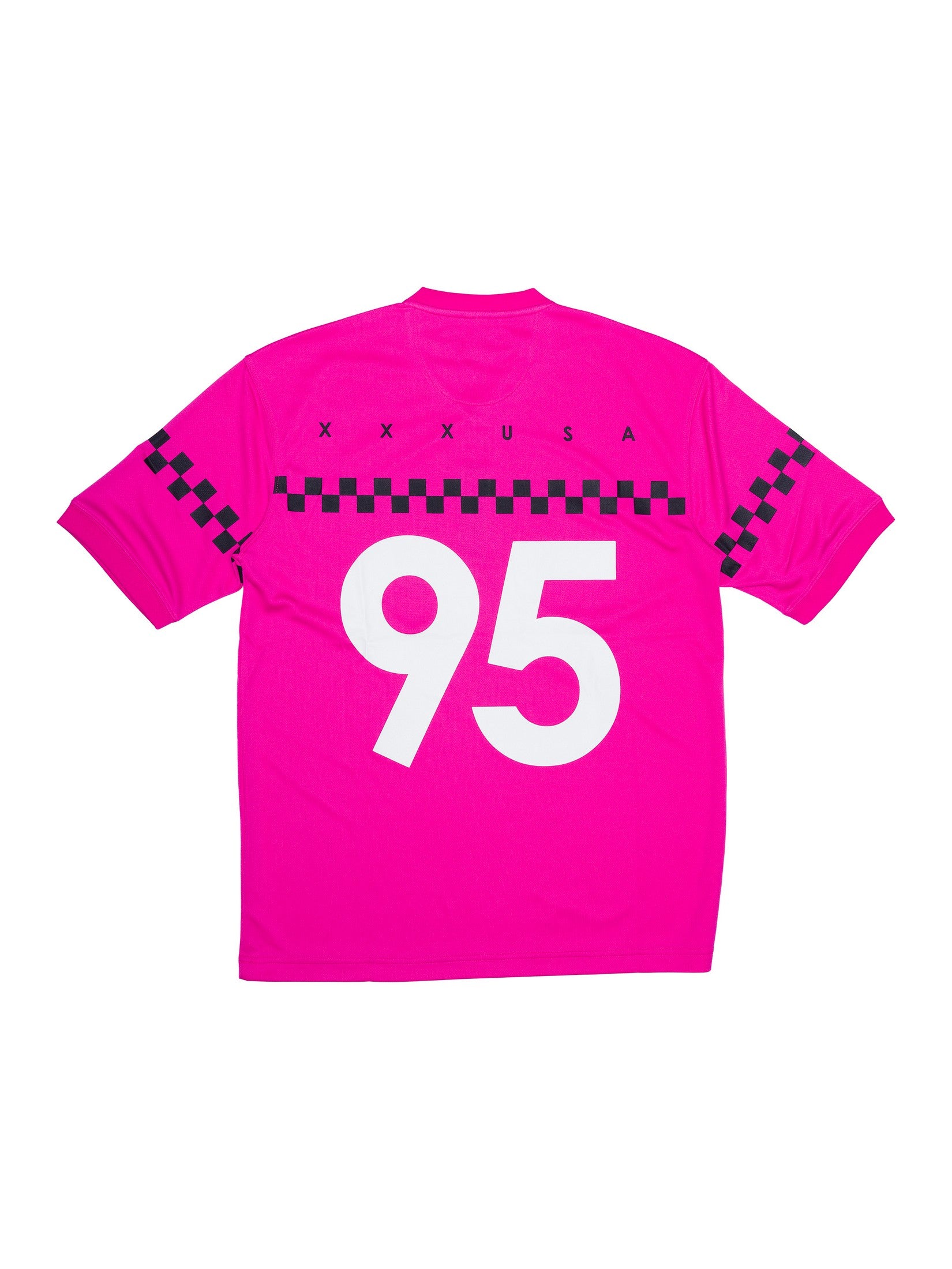 Turn up the heat. The 10.Deep Futbol Jersey in fuchsia is here to steal the spotlight with its high-octane color and street-charged attitude. Featuring a vivid fuchsia base, black checkerboard stripes, and oversized 95 graphics, this jersey fuses motorsport edge with soccer culture for a look that’s built to break necks.