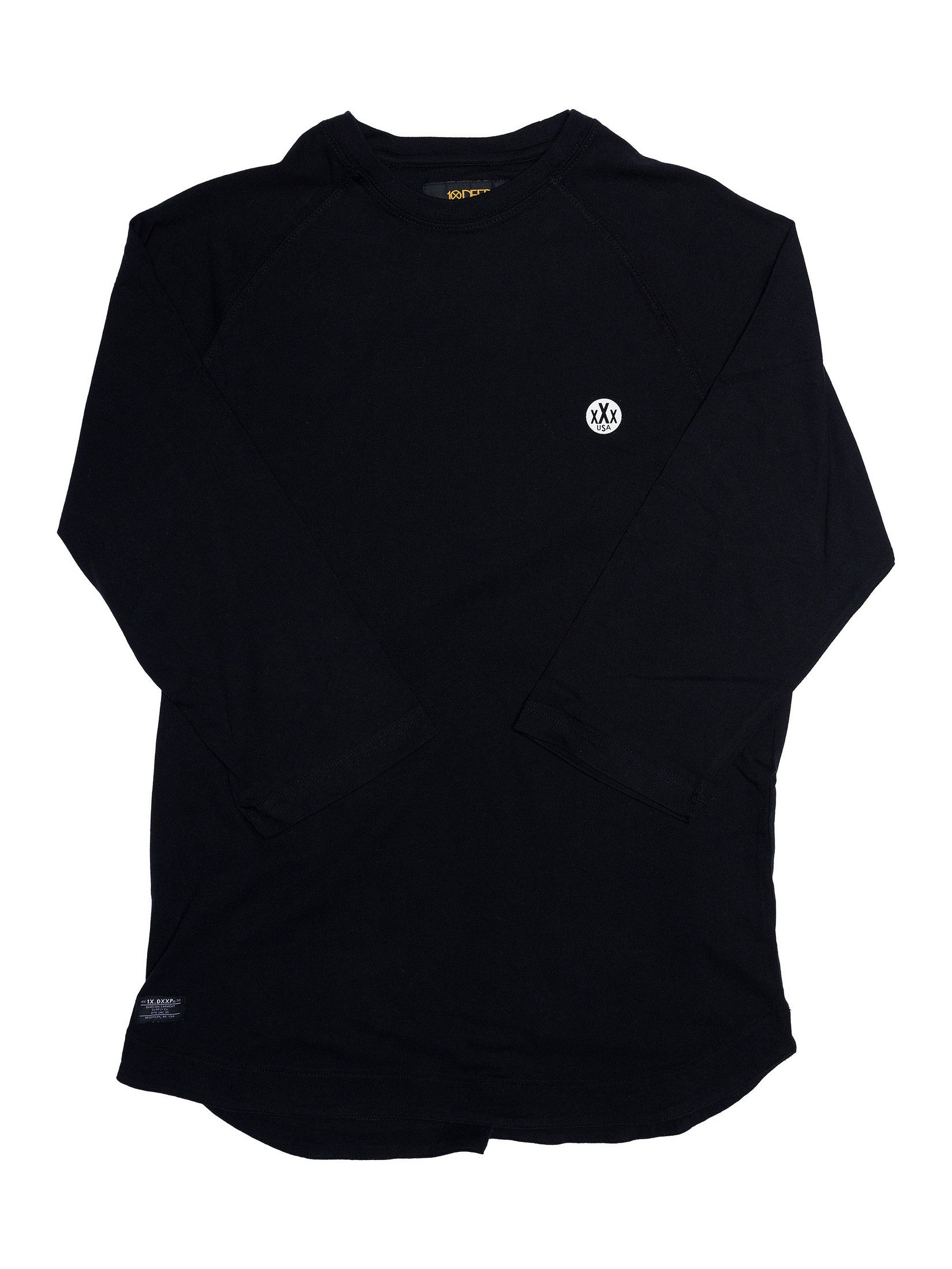 A long sleeve for short tempers. This baseball-cut tee keeps it minimal, with raglan sleeves and a raw-edge scoop hem that drops lower in the back. Stamped up front with the XXX USA seal—no extra noise, just signature grit. This one’s for the quiet ones who move loud.