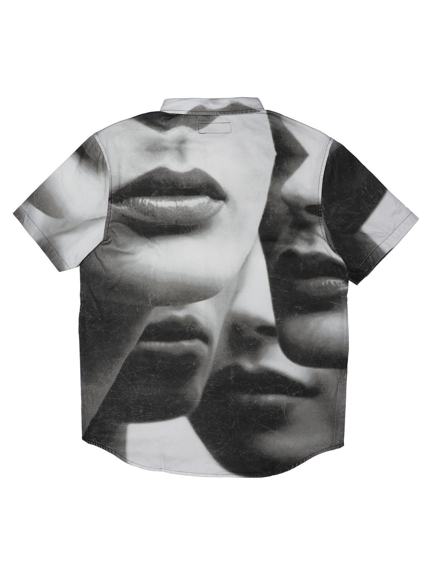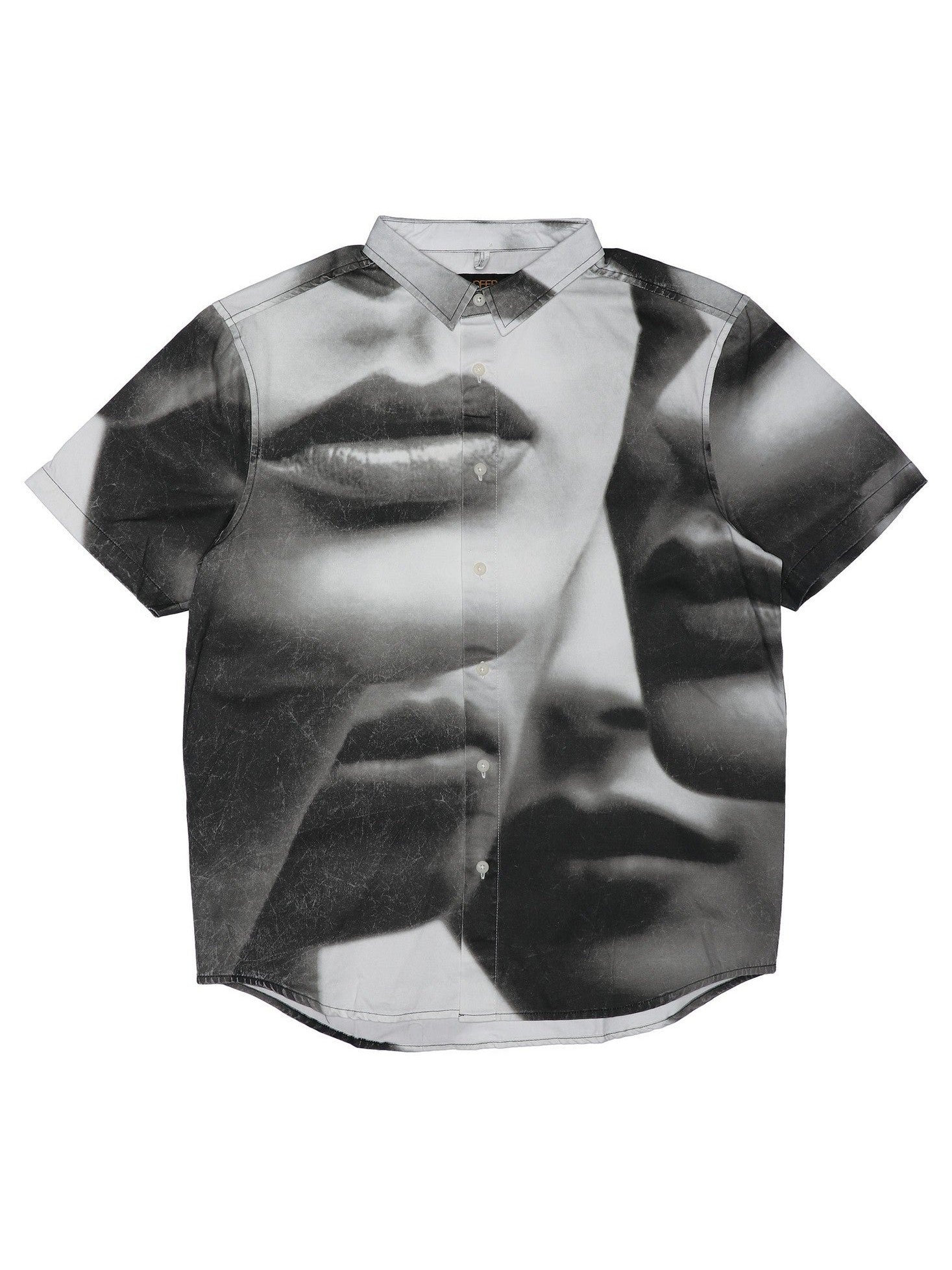 Your shirt doesn’t have to shout—this one whispers in grayscale and still gets all the attention. The Incite Button Down drops a surrealist collage across the front and back, printed edge to edge with a high-contrast face study that feels more film noir than fashion week. Lightweight with a clean fit, this one does all the talking for you.