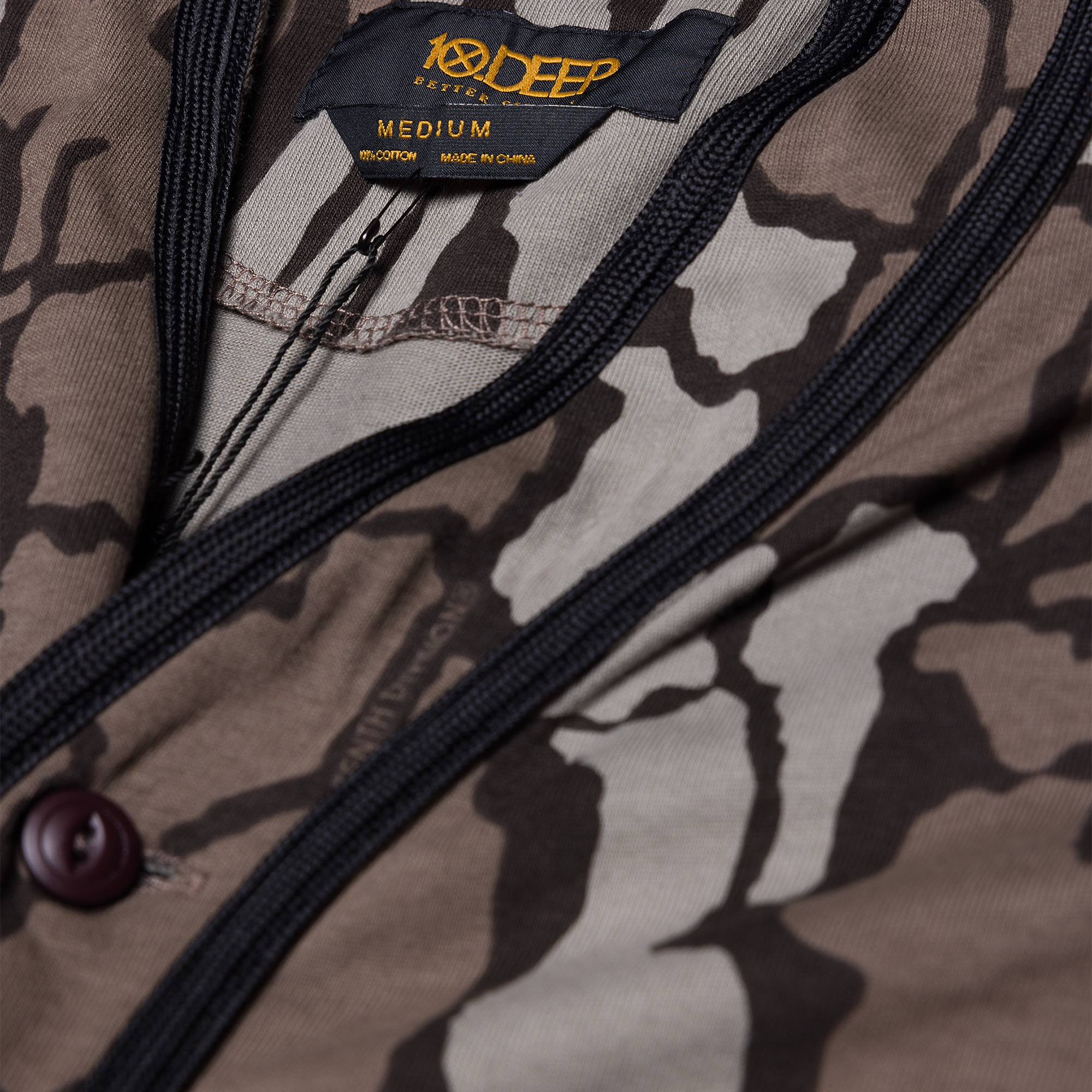 Step up to the plate with the Sandlot Baseball Jersey in Bark Camo. This isn't your little league uniform — built from soft 100% cotton and splashed with an allover bark camo print, it hits the perfect balance between classic sportswear and street-tough attitude. Finished with a full button-up front and short sleeves, it's ready for the streets, the stands, or wherever you make your plays.