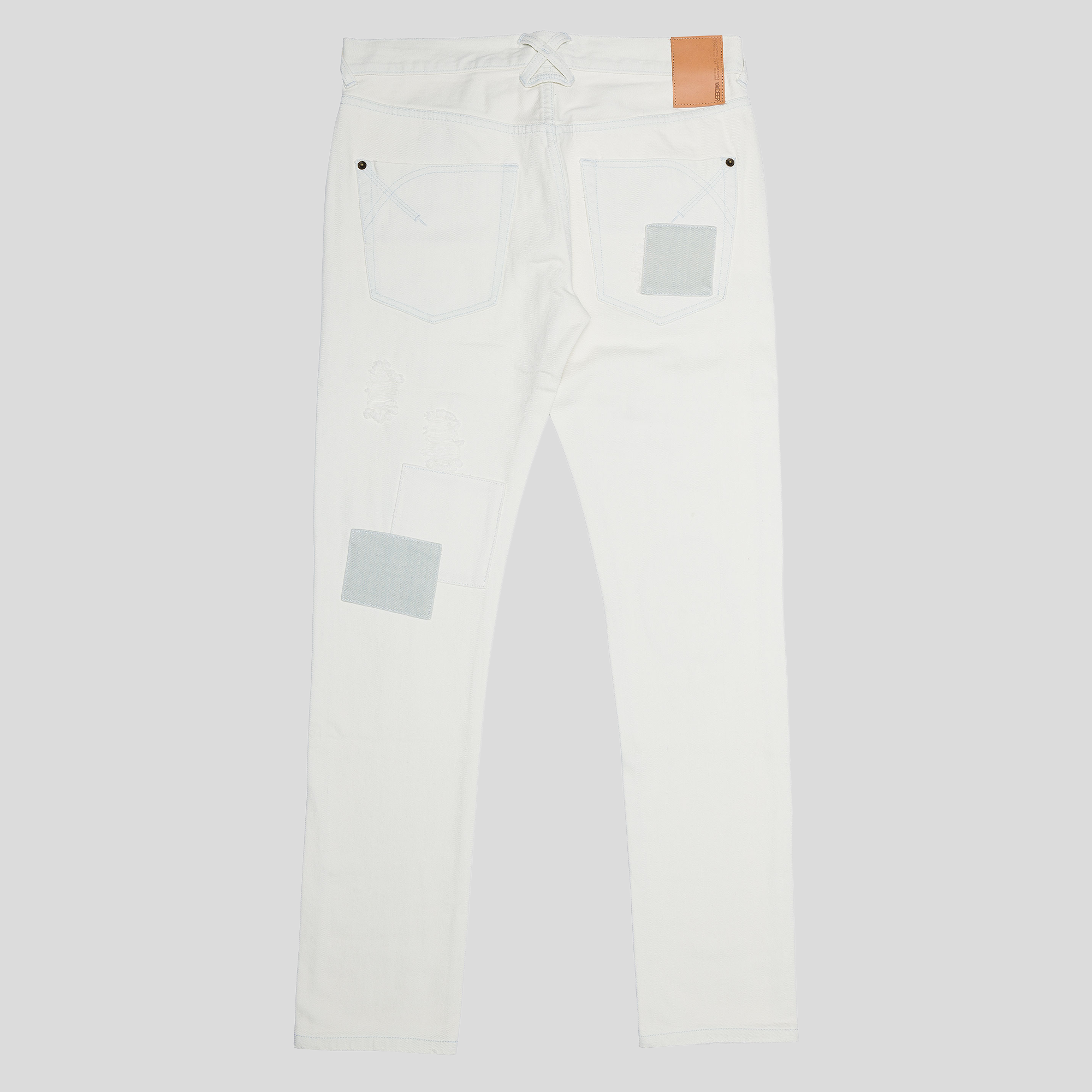 These ain’t your average whites. The Lazarus Denim hits in a clean Light Satin Wash, reworked with tonal patchwork and distressed detailing that’s subtle but flex-worthy. Stacked with contrast patches and reinforced stitchwork, they keep the vibe gritty while still clean. Tapered fit with just enough give—built for movement, not mannequin poses.