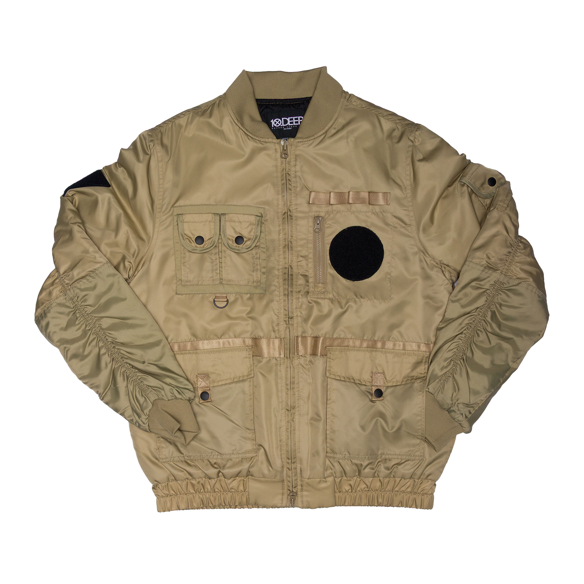 A throwback flight silhouette rebuilt for street utility. The Technician Aviator Jacket combines military influence with technical execution, layering nylon satin with an arsenal of details. Functional chest patch pockets, lower snap pockets and zipper stash at the chest all ride alongside webbing straps, D-ring hardware and tonal overlays. Elastic cuffs and hem pull it tight.