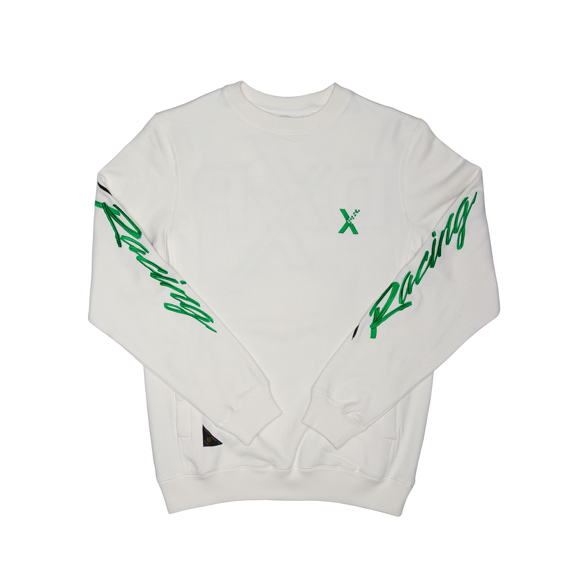 Start your engines. The X-95 Racing Crew pulls influence from speed culture and flips it with heavyweight stitching and graphic hits that feel more garage-grown than track-ready. Neon “Racing” script down both sleeves, a micro chest X-checkered flag hit up front, and a full-scale DXP logo running through a checkerboard grid out back. All printed on a clean off-white fleece body—this is racing team energy without the sponsorship contracts.