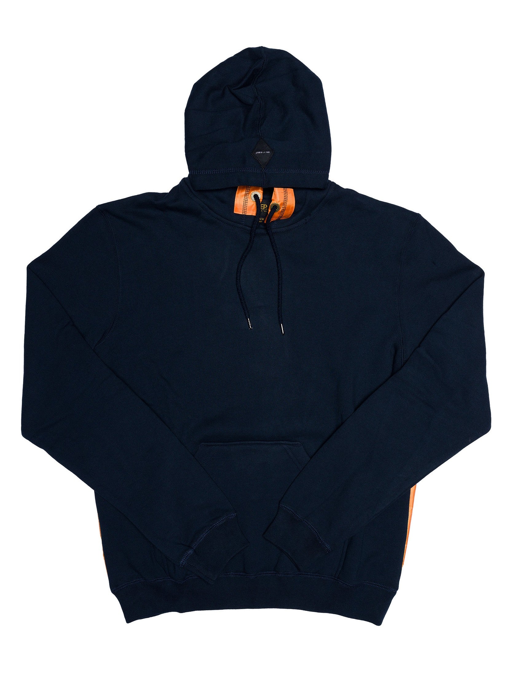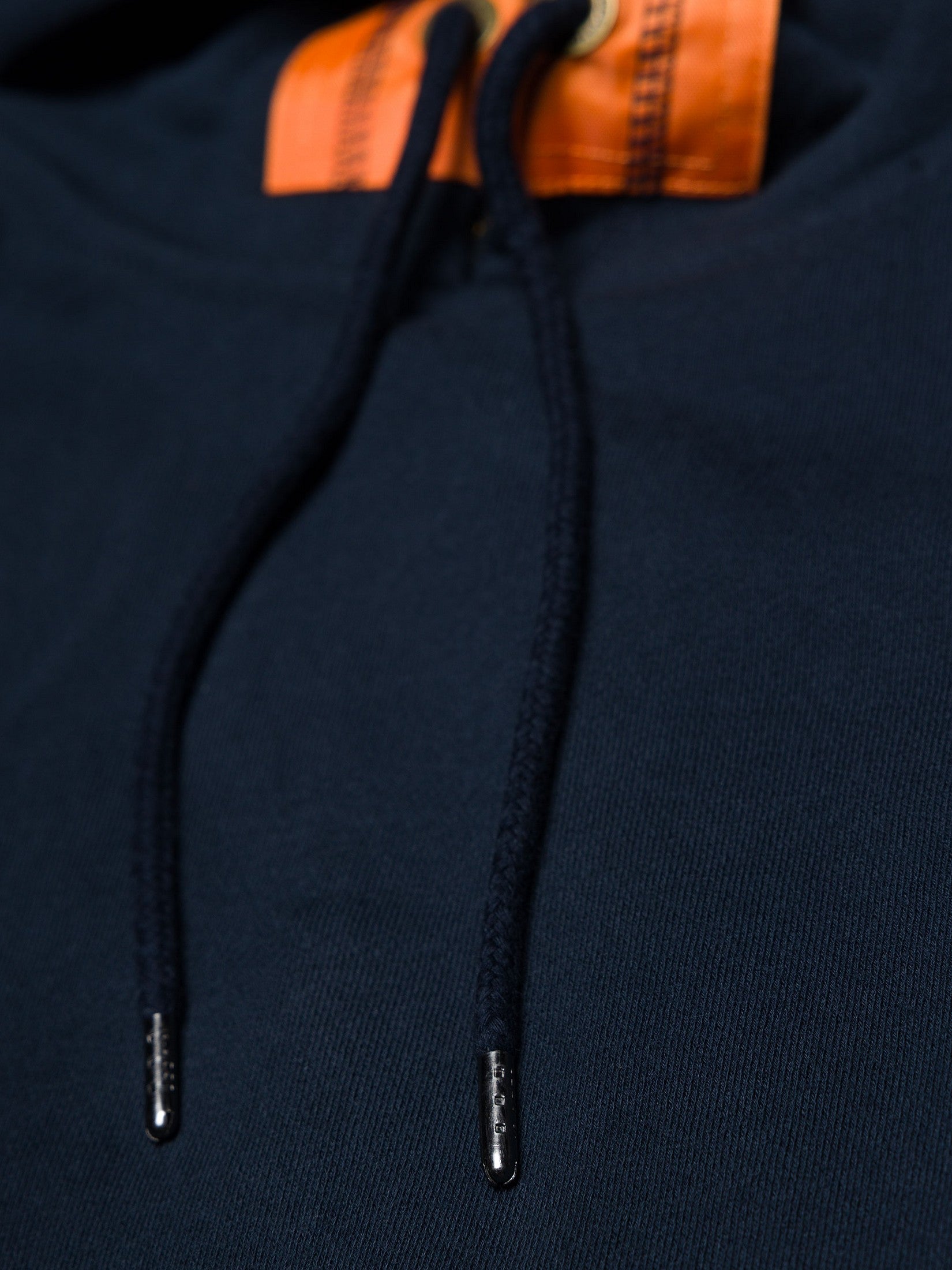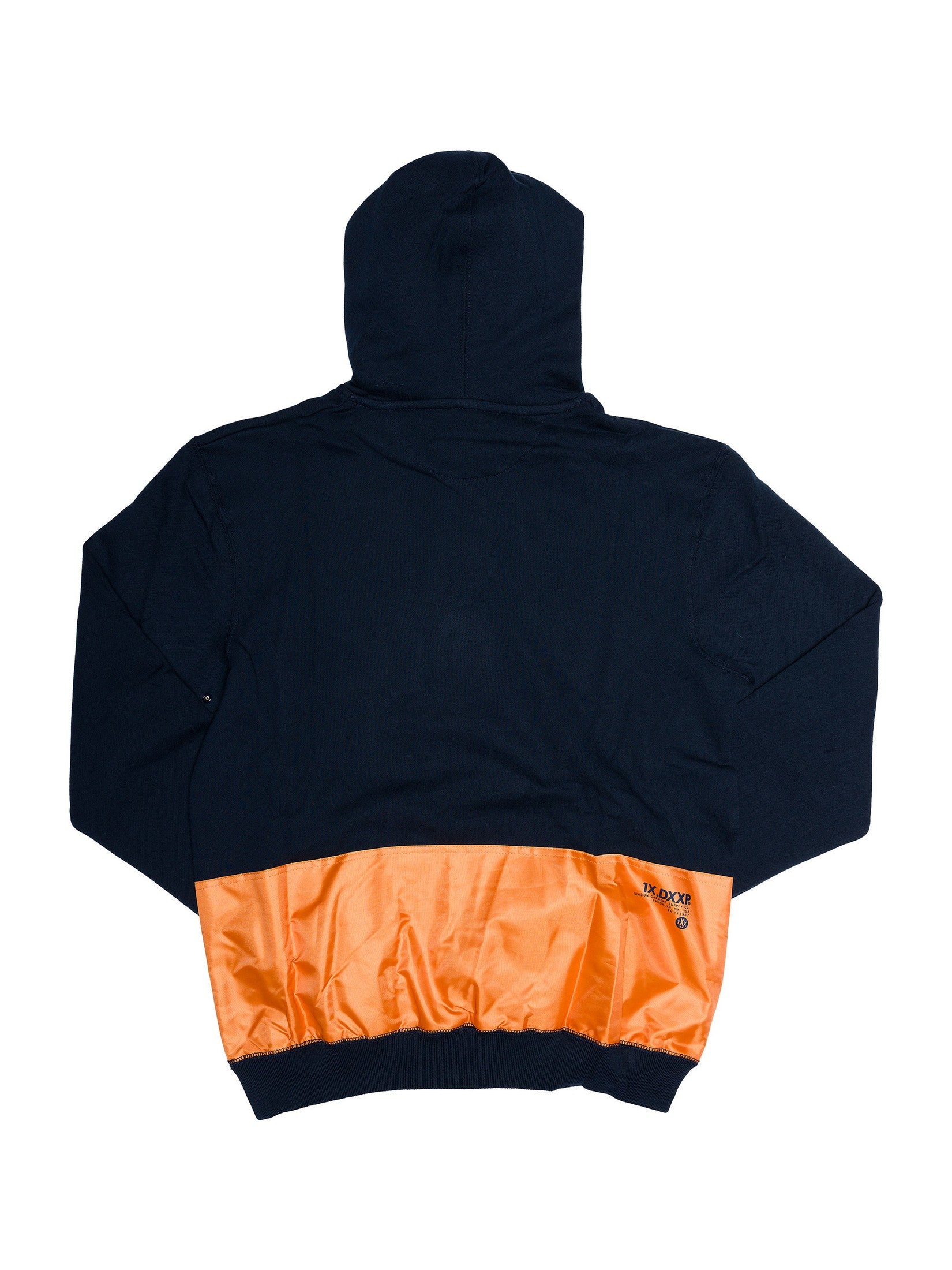 Navy + danger zone. This pullover’s all stealth from the front—clean, heavyweight cotton build with tonal drawcords and a subtle diamond label hit. But it’s the flip that sets it off: high-vis orange satin paneling at the rear hem, stamped with IX.DXXP® tactical coordinates. Built for those who move silent but make statements.