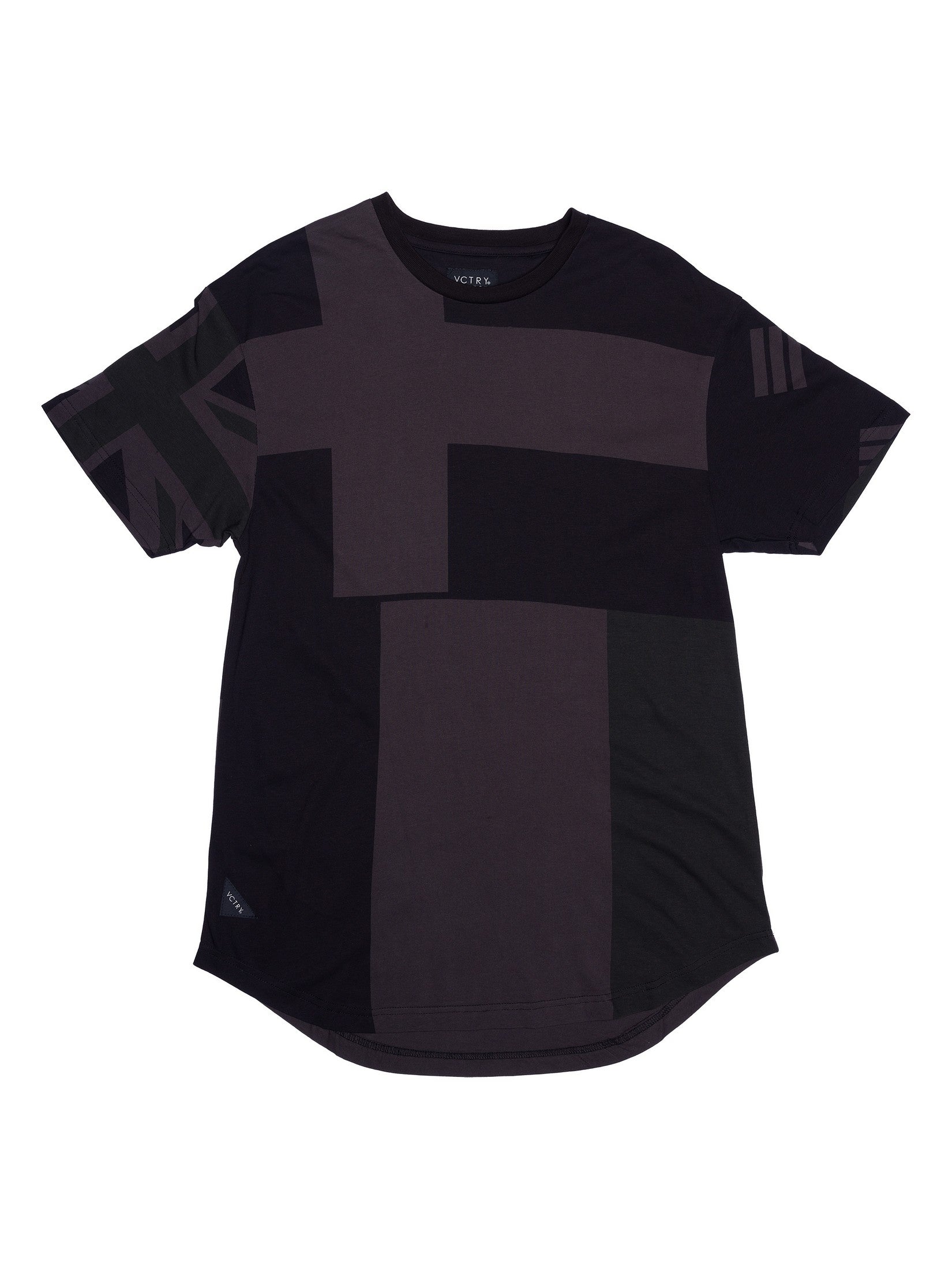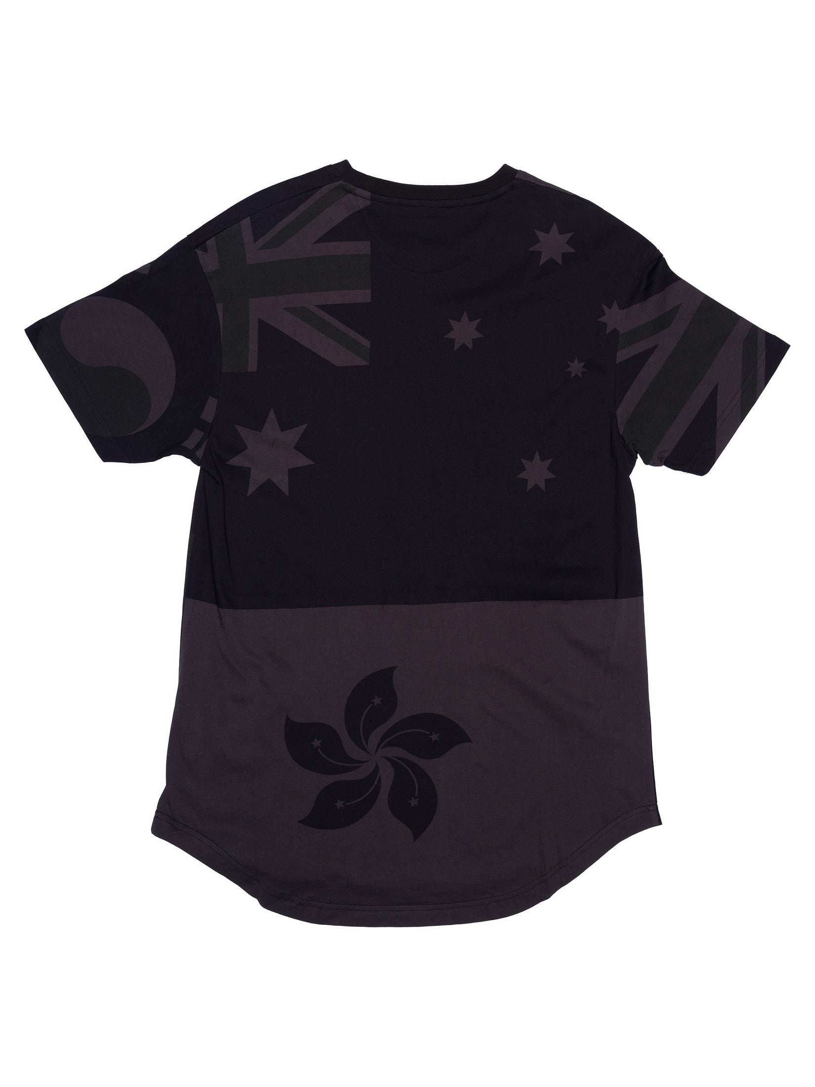 Cut from shadow and sewn with symbolism, this tee taps into international iconography with a ghosted collage of flags from around the globe. It’s got that minimalist energy with a militant undertone—like a graphic protest in stealth mode. Scoop hem keeps it modern, while tonal printing lets the details speak when the light hits just right.