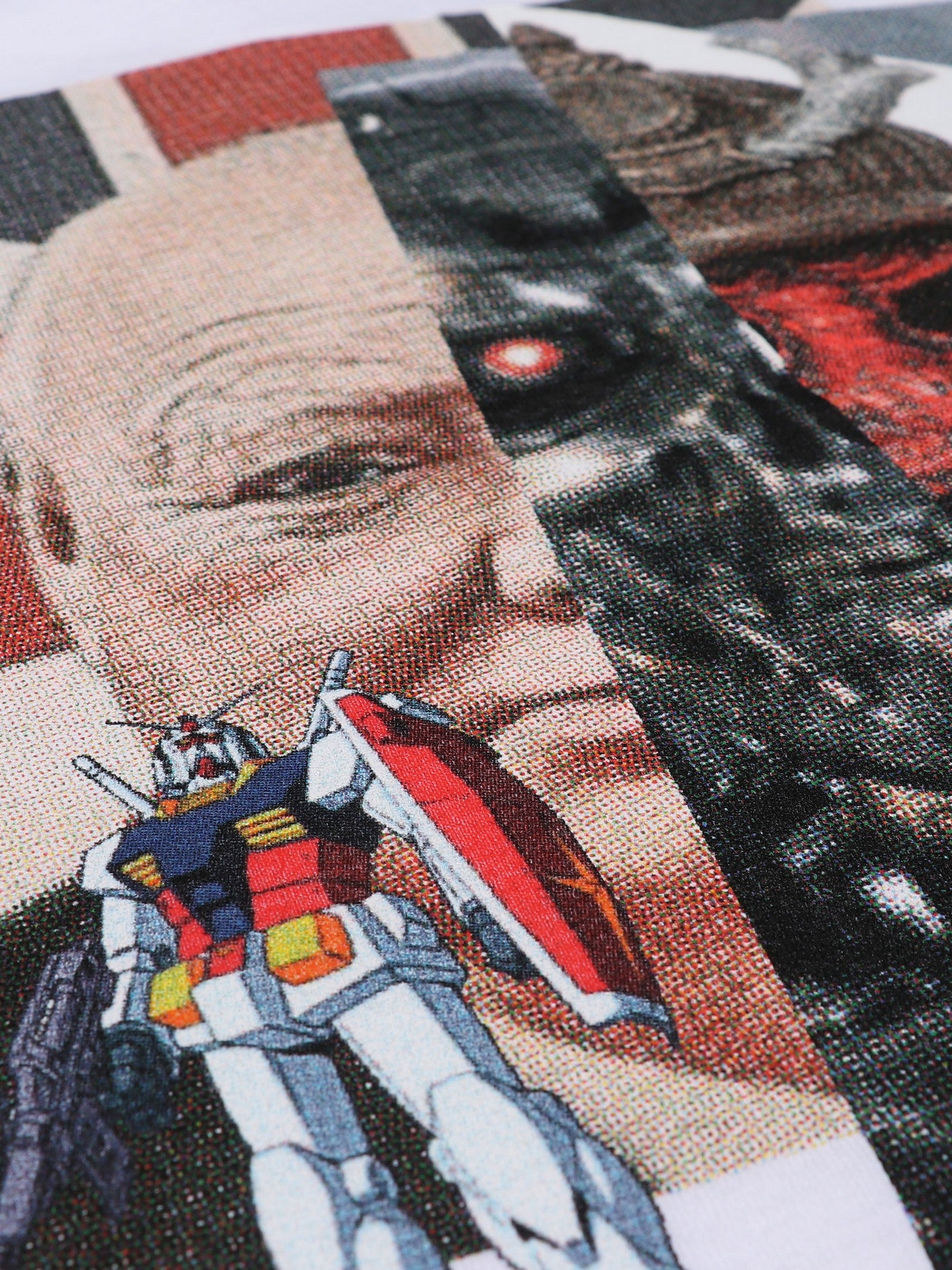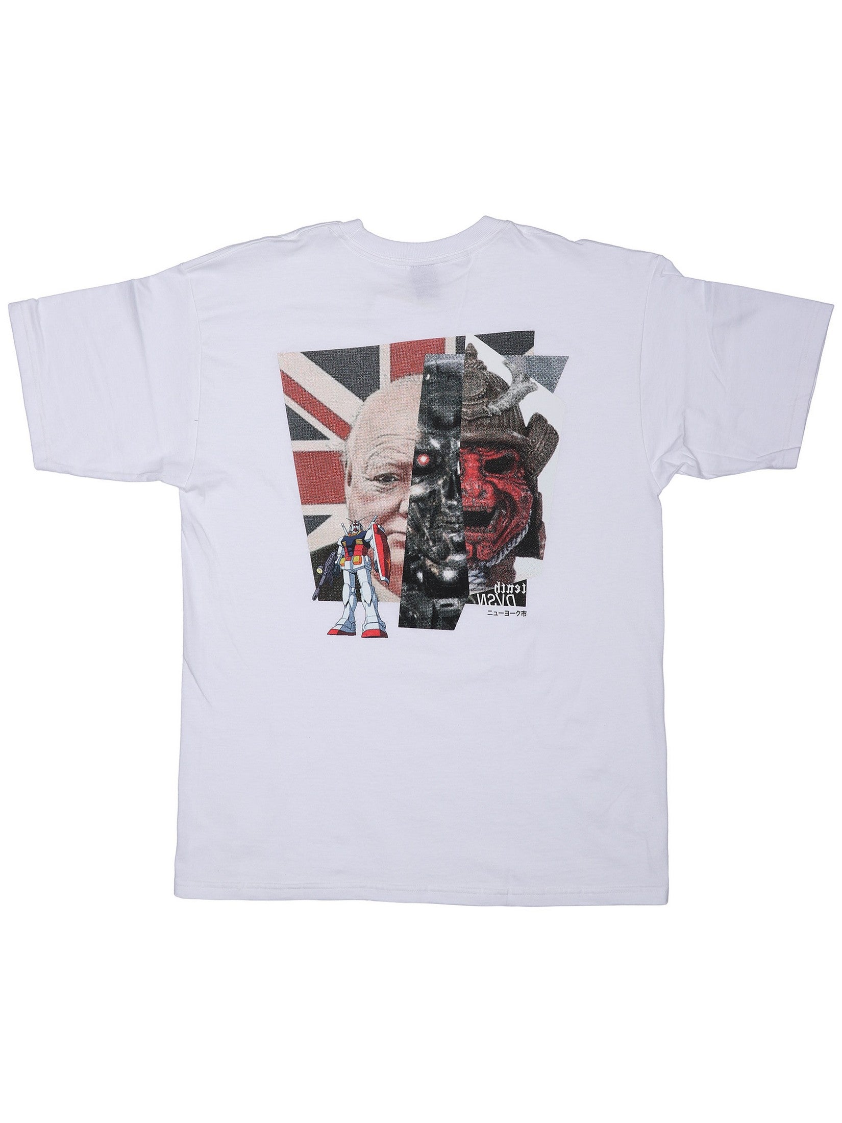 Old icons, new codes. The New Forms Tee remixes history, anime, and dystopia into a collage that hits like a broadcast from a parallel dimension. Quiet up front with a small chest graphic—chaos out back with a full-scale print that fuses classic British war imagery, Gundam, and cybernetic death.