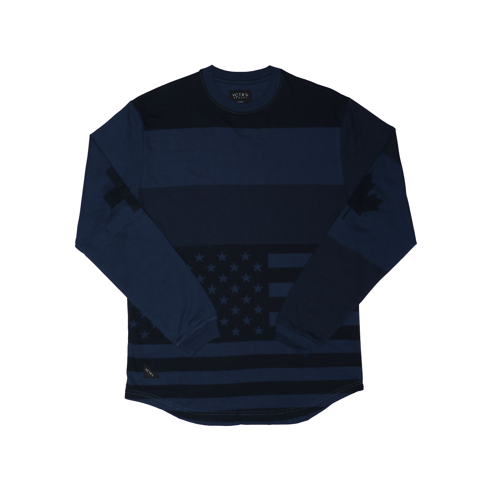 Flags of the future. The Ceremonies Long Sleeve layers up symbolic graphics across a midnight blue base, from remixed Americana to celestial iconography. Tonal prints mean it hits subtle, but speaks volumes. Salute the new world.