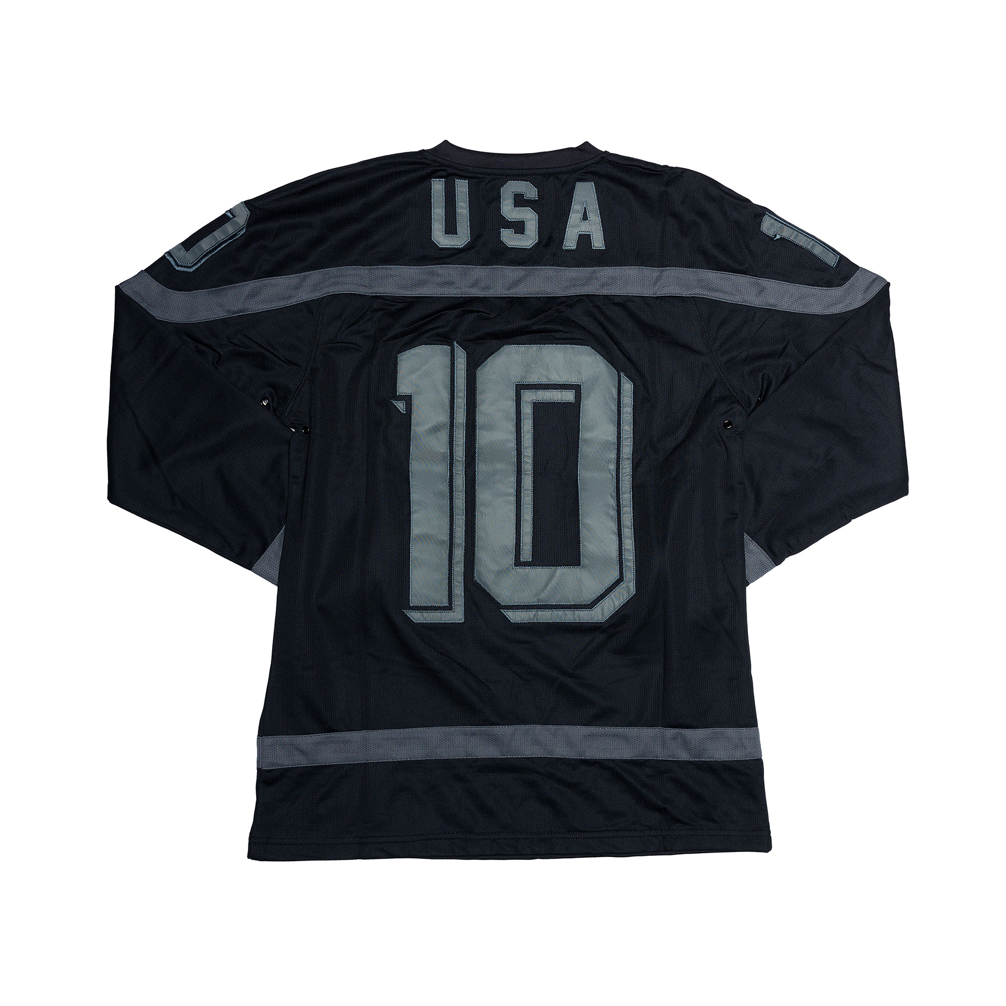 This jersey features a classic V-neck collar and is adorned with embroidered "10" graphics on both the front and back, paying homage to traditional hockey aesthetics. Two horizontal stripes across the body add a dynamic visual element, enhancing its sporty appeal. Hemmed cuffs and bottom ensure a clean, structured silhouette.