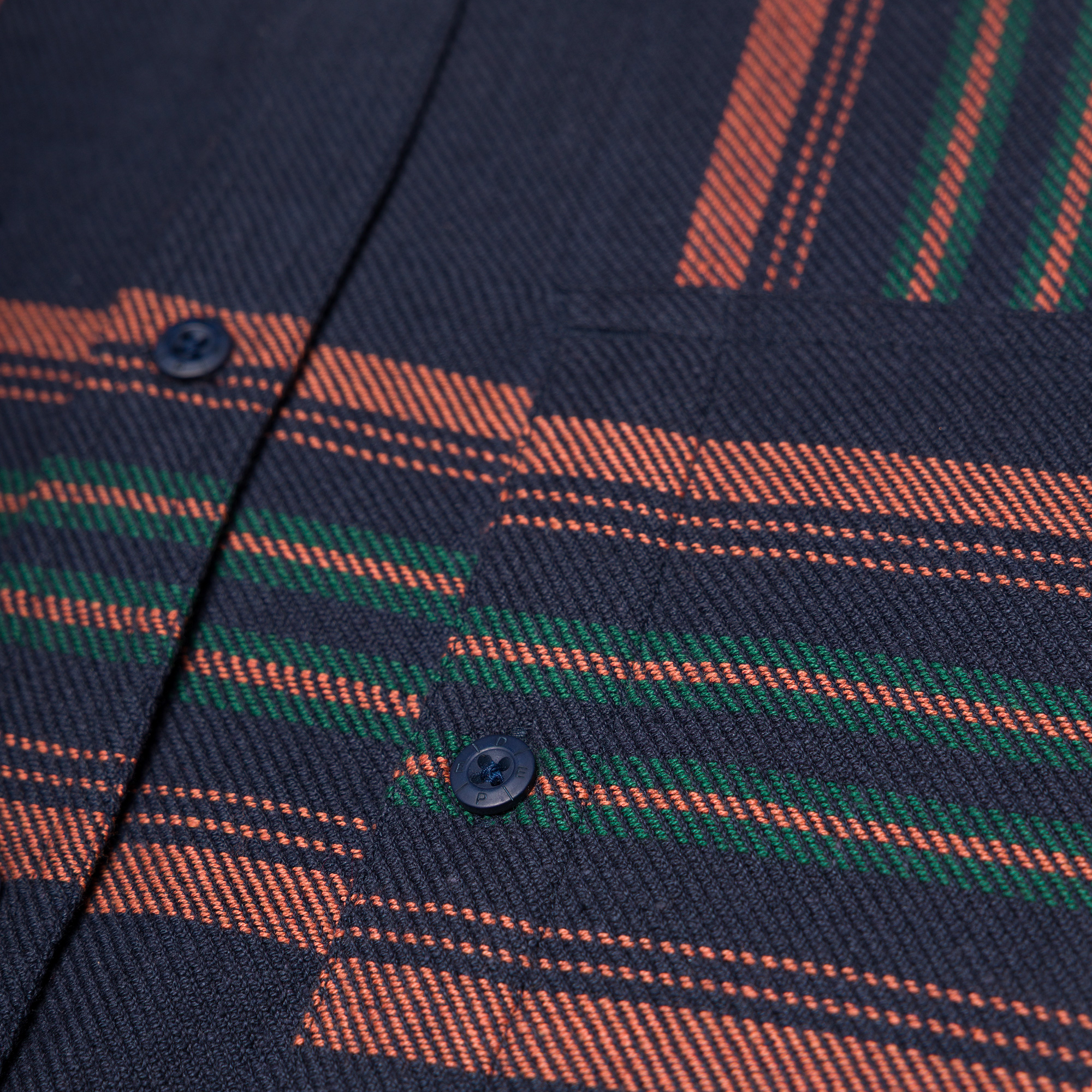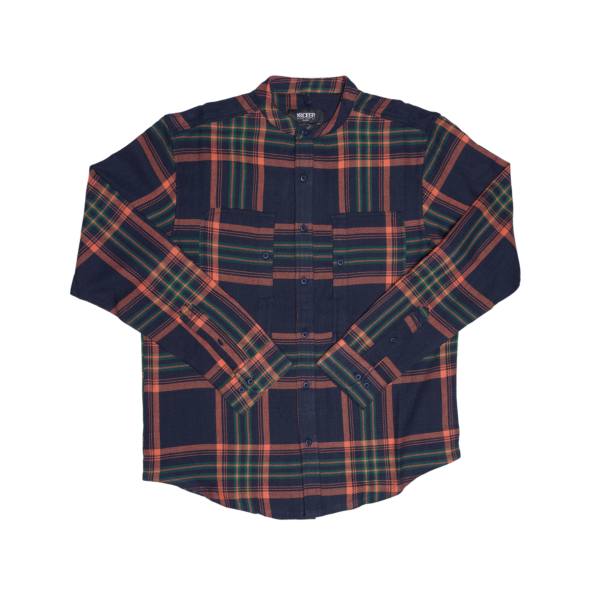 Cut from heavyweight brushed cotton flannel, the Mandarin Work Shirt is a stripped-back utility layer with a bold plaid twist. Features a collarless neckline, dual chest pockets, and a curved hem. Finished with tonal embroidery at the back shoulder.