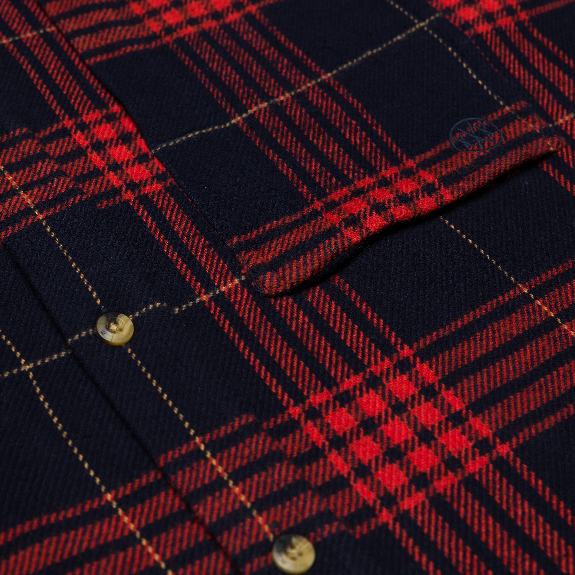 A remix of classic workwear silhouettes with 10.Deep’s signature flipped detailing. This long sleeve button-up is cut from a rugged plaid flannel, but the band collar and oversized chest pockets set it apart from the usual.
